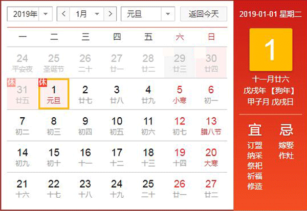 2018年12月31日—2019年1月1日,共計放假時間2天。