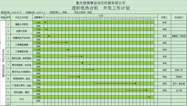 透析紙熱合機在廣大公司應用廣泛,近日,重慶駿精賽接到此項目后,分析了設備制作架構,熱合工藝問題,準備開展實施工作計劃,做出了橫道圖。如下: