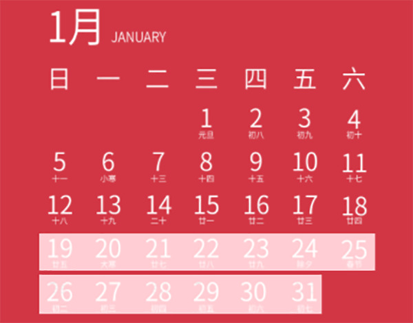 公司春節放假時間為2020年1月19日-1月31日,共13天,春節正式上班時間為2月1日(農歷正月初八)2月2日星期日為正常上班。
