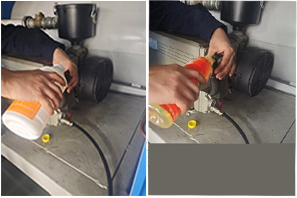 三、排完后,關閉卸油口,從注油口加入真空油與柴油的混合液體(1:1比例)。在開機運行30分鐘,是液體在泵內充分運轉,以便帶出臟物。然后再次排除液體。