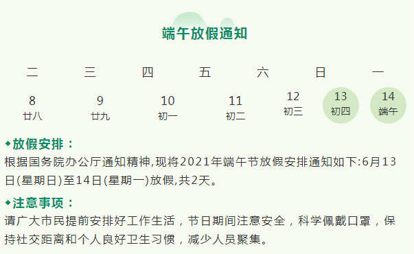 我司駿精賽應國家放假規定,再結合公司實際情況,2021年端午節放假安排如下: