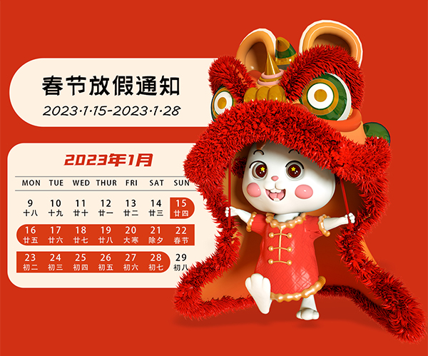 根(gen)據國家(jia)放假規定,并(bing)結合我司的實際狀況,重慶駿精賽自動(dong)化(hua)機械有限(xian)公司2023年春節放假時(shi)間具體安排(pai)如下: