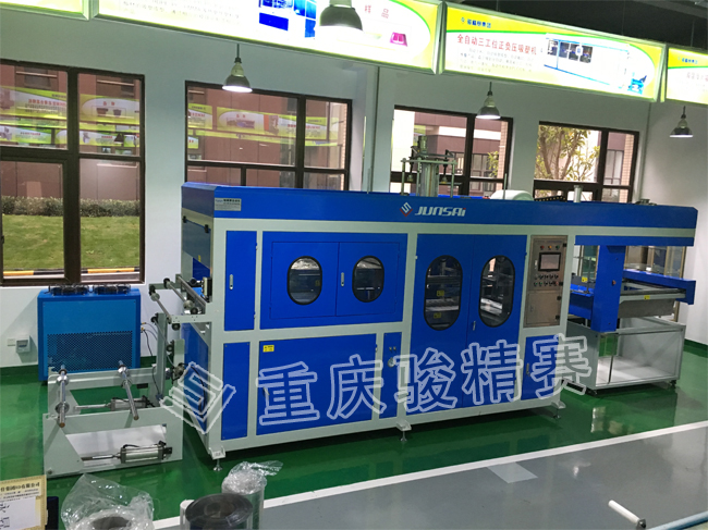 ※、全自動吸塑機成型系統:下模采用加大桿Φ90mm氣缸,軸套配有含油自潤軸承,減少摩擦系數可讓上下模工作平穩,裝配可調試電動活動模盤,并帶冷卻水循環冷卻功能。上模采用加大氣缸,上下加強型氣缸板固定,4導套、導桿定位準確定位。電動上模行程調節限位控制開關。